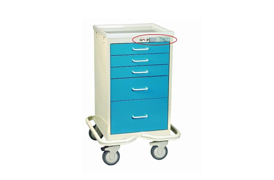 MPD 5 Drawer Cart with Proximity Reader: MOT-524. Mini Towers combines most of the space-saving features of Mini Carts plus the advantage of large 5″ Premium Casters (2 casters locking, 1 directional) and an Outrigger Stabilizing Frame. Moreover, MPD Carts are proudly made in the USA and are latex-free. The image shows the MOT-524 cart in Crash Cart Blue.
