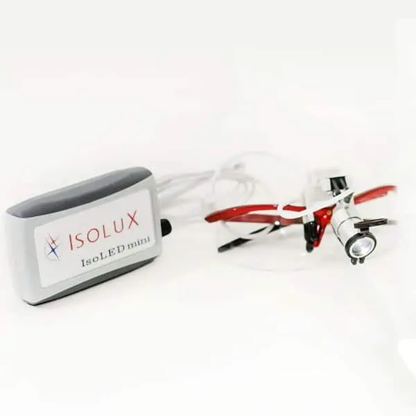 ISOLUX IsoLED Mini Examination Headlight System IL-2396. Lightweight and versatile, the IsoLED mini LED Examination Headlight allows for unencumbered mobility for the practitioner. The IsoLED mini Examination Headlight lithium battery lasts more than 10 hours at maximum intensity. The mini can be affixed to personal eyeglasses, safety glasses, and soft or hard headsets for additional stability during procedures. In addition, the mini comes with a removable filter that reduces blue and UV light, preventing premature composite curing in dental procedures. Suitable for medical, veterinary, and dental examinations and procedures.